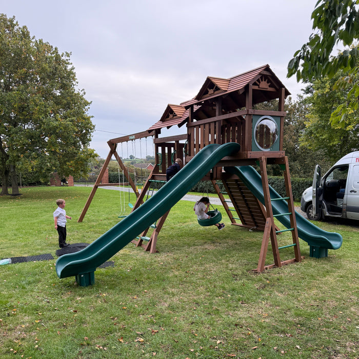This Manchester Premium Pack 7 provides to BIG slides. One 14ft long and the other is 12ft long. With a rock wall, monkey ladder, climbing net, spilt level platform and 4 swings this set will keep the children entertained for years.