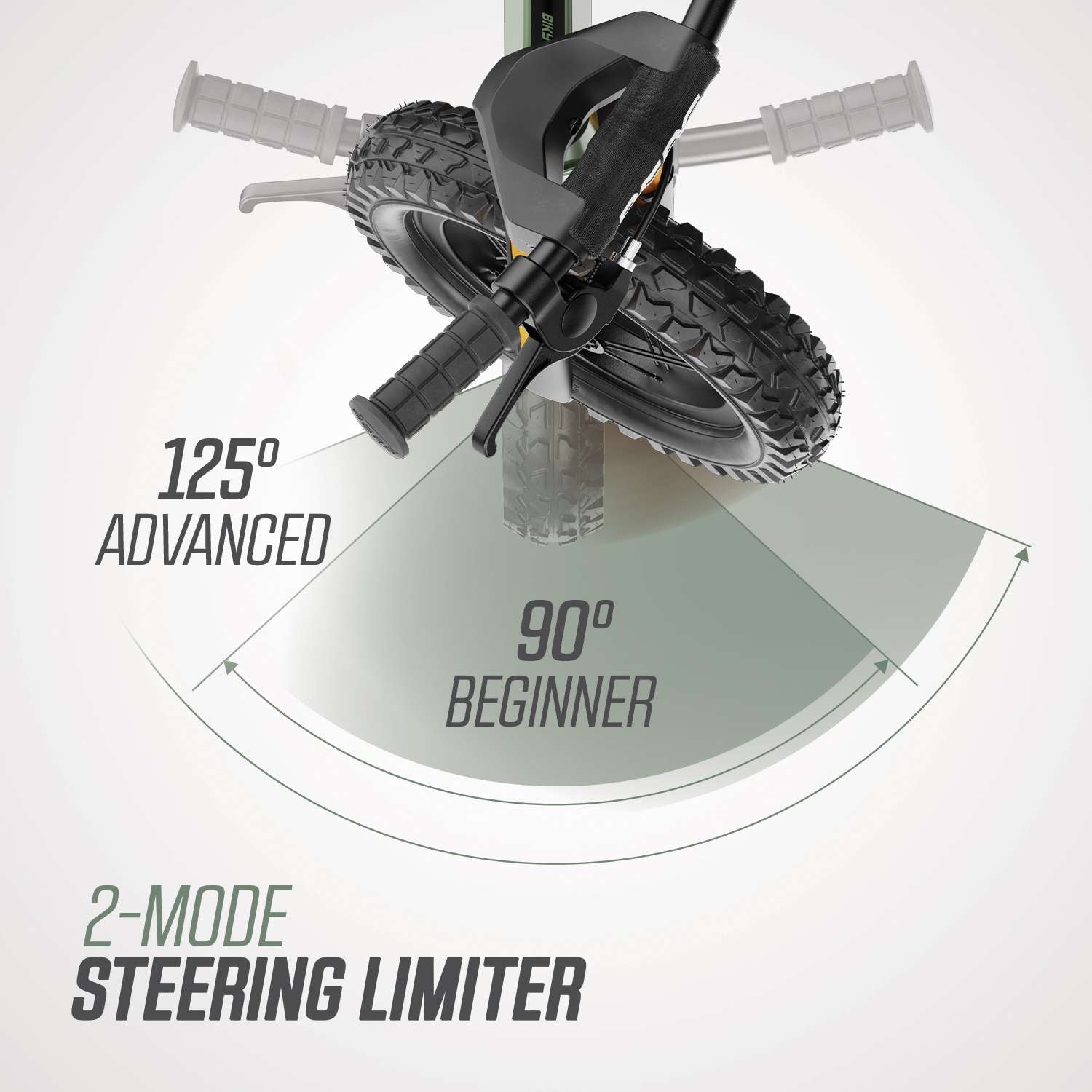 This BERG Biky Cross version features 12 wheels with 5-spoke aluminium rims and wide pneumatic cross country tyres with terrain tread, this provides excellent performance on any surface. This Biky is also equipped with clever controlled steering with handlebar pad, comfy grips and angle limiter, which can be set to in two positions. The narrow angle steering mode offers more safety for children that just start their adventure with the bike. The wide angle mode offers better manoeuvrability and is recommended for more experienced riders. If you child wants to slow down they can use the handbrake that is found on the right handle bar.