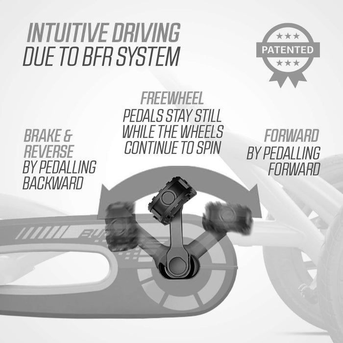 The BERG Buddy is equipped with the unique BFR system. BFR stands for Brake, Freewheel and Reverse. With the BFR system, you can brake with the pedals, and can also reverse immediately after stopping.