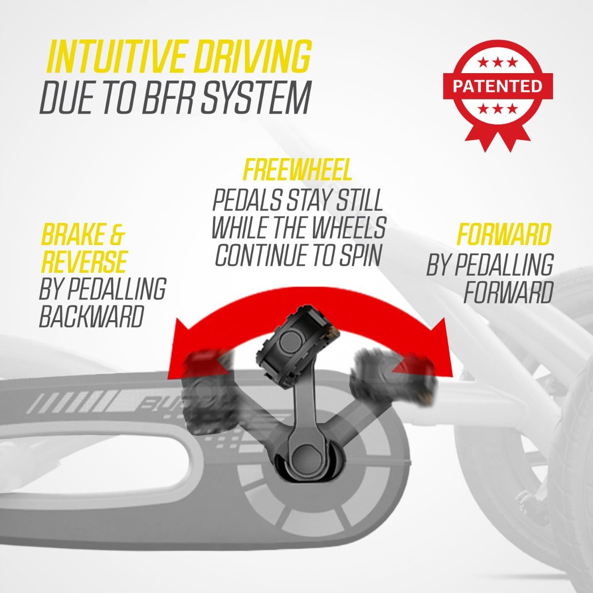 The BERG Buddy is equipped with the unique BFR system. BFR stands for Brake, Freewheel and Reverse. With the BFR system, you can brake with the pedals, and can also reverse immediately after stopping.