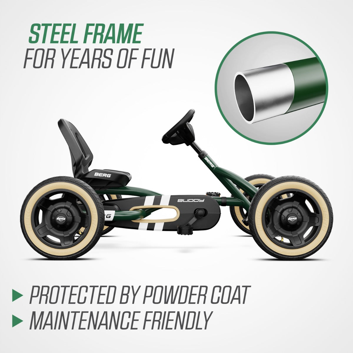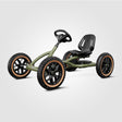 With a painted frame in a beautiful olive green shade and contrasting skinwall tires for a stylish and rugged look, the BERG Buddy Trail Green is the ultimate cool pedal go-kart for the under-eights.