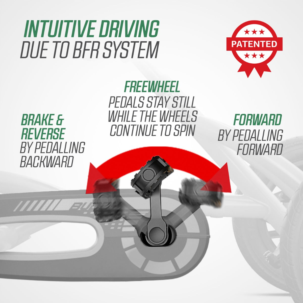 The BERG Buddy is equipped with the unique BFR system. BFR stands for Brake, Freewheel and Reverse. With the BFR system, you can brake with the pedals, and can also reverse immediately after stopping.