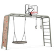 - This set includes Monkey bars, climbing wall, nest swing, gym rings and a basketball hoop.