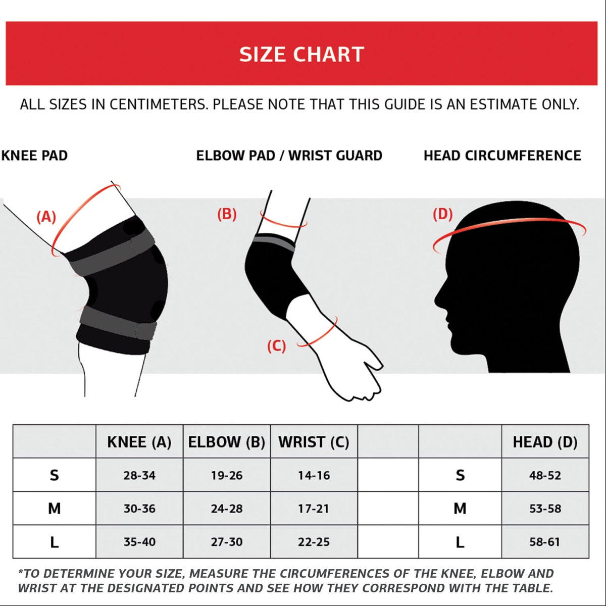 To determine the size required, measure the circumference of the knee, elbow and wrist at the designated points and see how they correspond with the this guide.