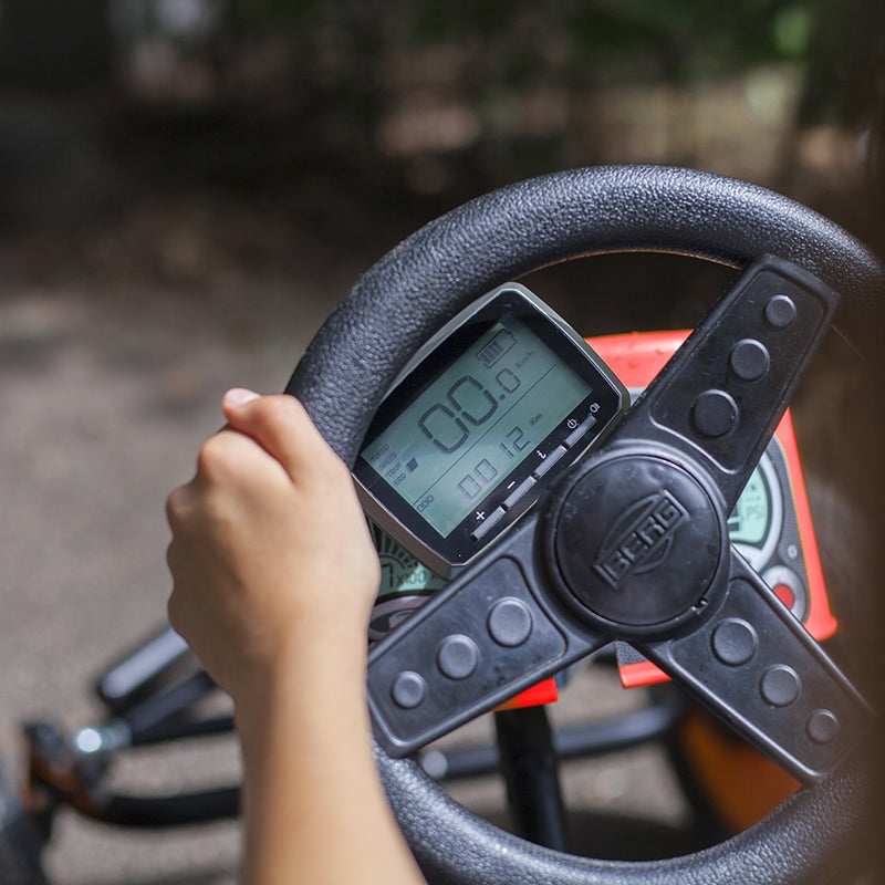 What s nicer than a fast race to see how hard you can go? The BERG E-Go-kart also comes with a display. This illuminated screen tells you how fast you are going, how much you have ridden and how much battery power you have left. The 24V/240Wh battery is removable which makes it easy to charge.