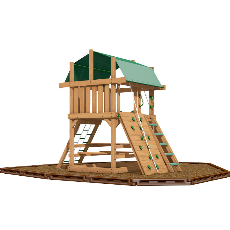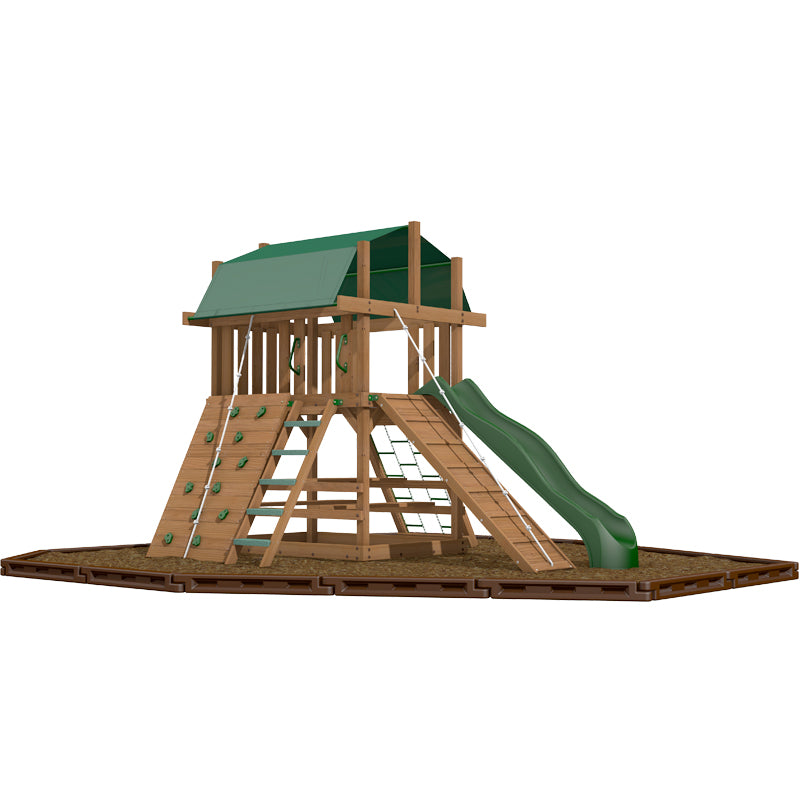 A picnic table, rock climbing wall, chain climber, ramp and a picnic table complete this set.