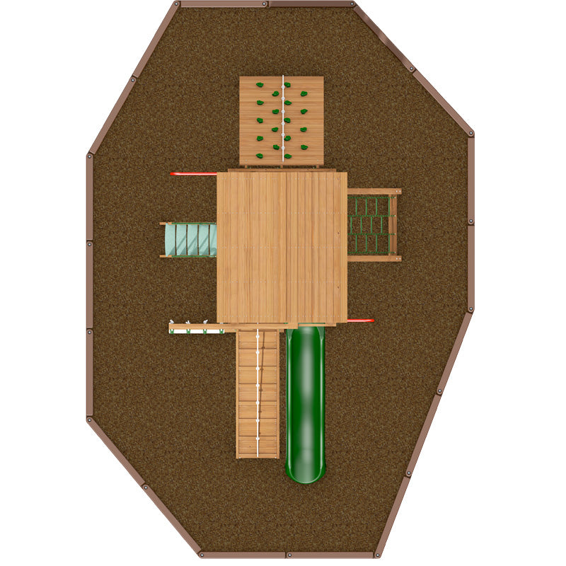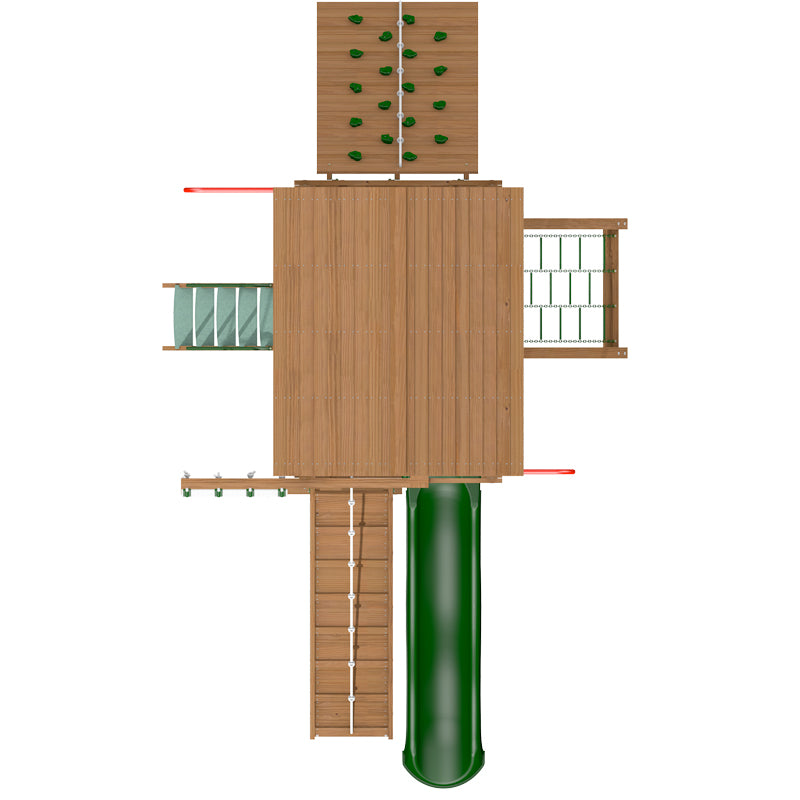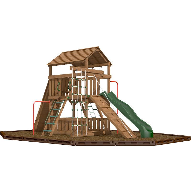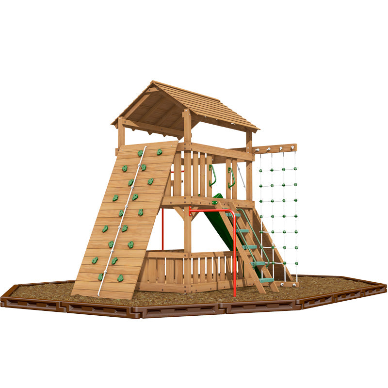If swings really are not your thing then leave them of. Choose instead to focus on the other popular play features. It is amazing how much play value you can get on a small space. If you are looking for climbing features then this is the set for you. A large rock climbing wall, chain climbing net, deluxe rope ladder, firman's pole, chin up bar and a ramp all on a compact foot print. The set is finished with a lower play area that gives a total of nearly 70 sq ft of play area when combined with the raised platform. The wooden roof is the final touch.