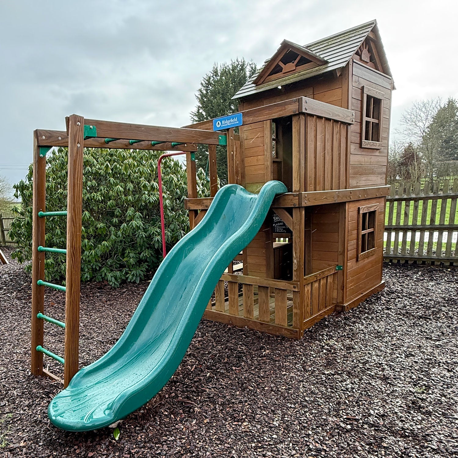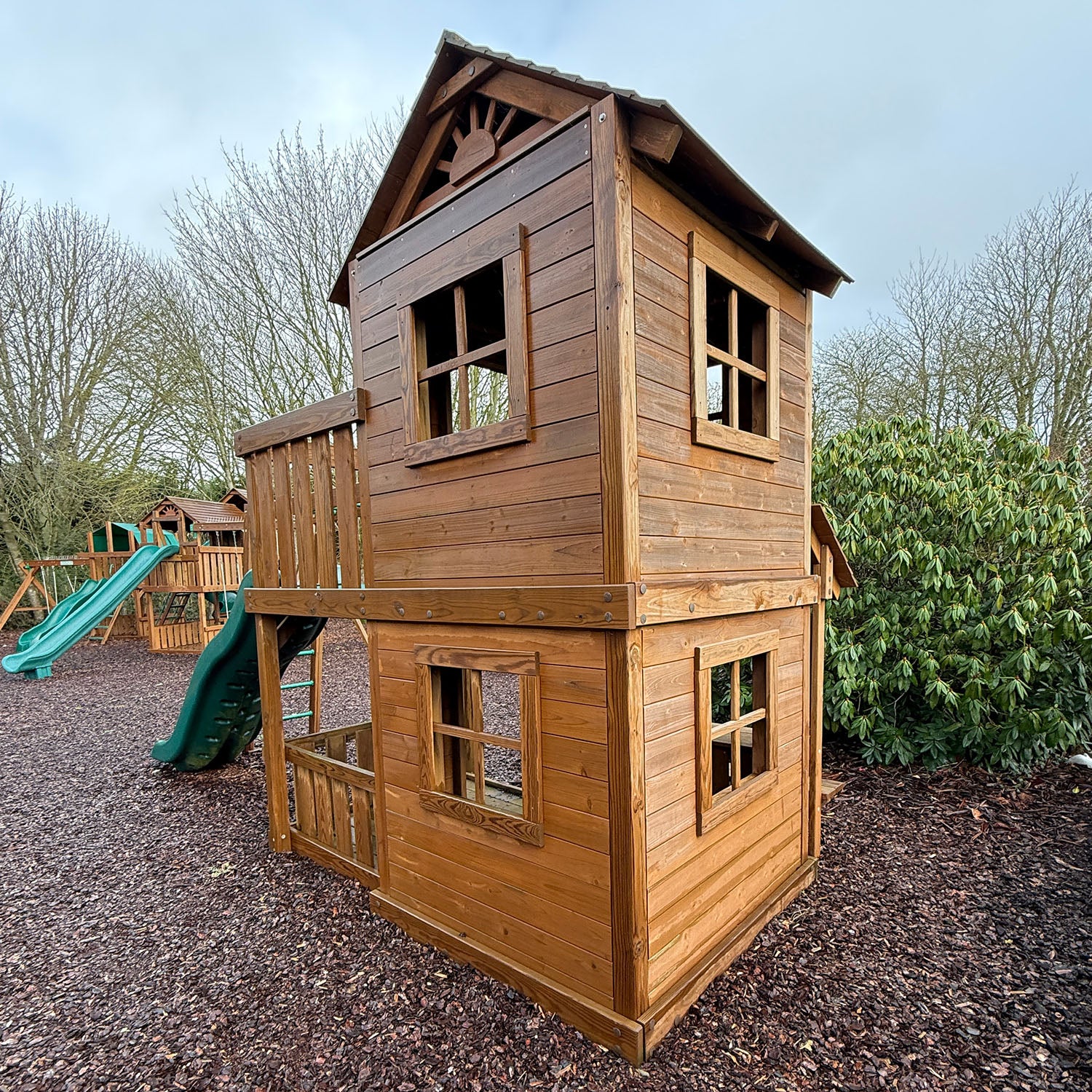 This set includes two 5ft x 5ft enclosed playhouse, one on the raised platform the other at ground level. The playhouse at ground level includes an Ice cream counter for imaginative role play games and verandah floor and play walls. A large monkey ladder, upgraded super / luxury wave slide, fireman's pole and access ladder handles complete the set.