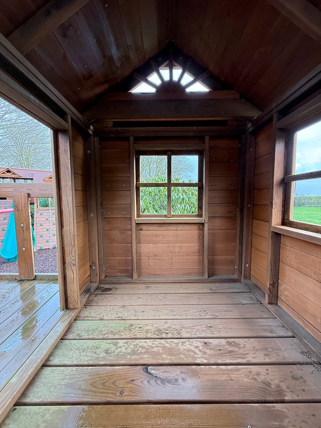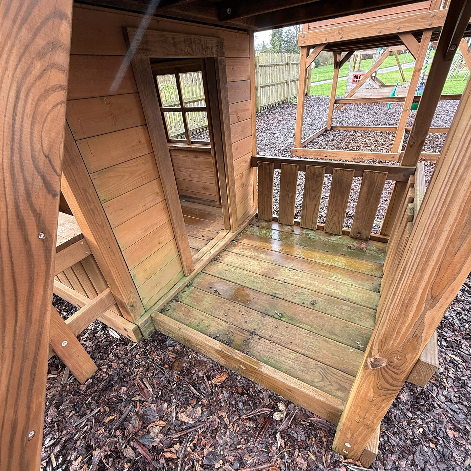 The platform is 157cm x 274cm (5ft x 9ft) more than big enough for mums and dads as well. The platform has two areas one is the raised enclosed playhouse and the other is the external porch. Big and sturdy, the Ridgefield can be outfitted with a wide range of accessories. Imagine how much fun your children will have playing on this.