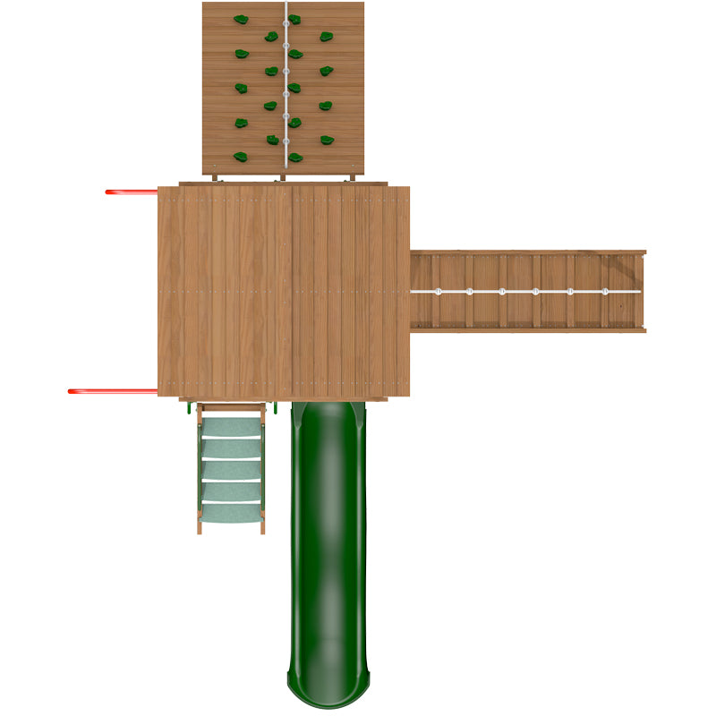 This set is enhanced by the upgraded wooden roof, lower play floor and play walls, it has the largest rock climbing wall, climbing ramp, fireman's pole and chin up bar.