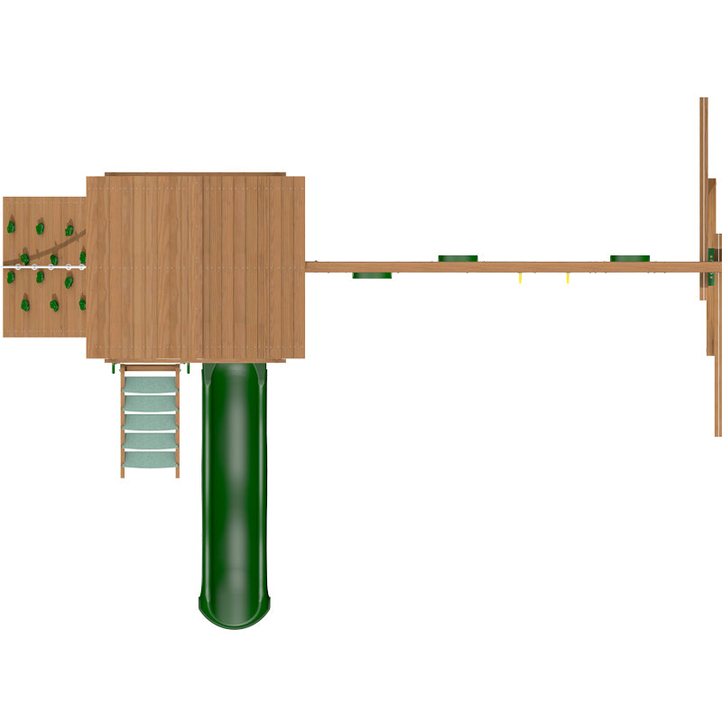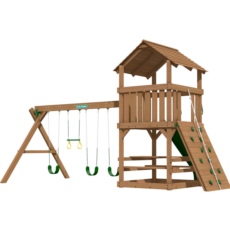 Similar to Premium pack 2 but with a wooden roof to replace the standard tent roof.The swing section has four swinging positions with 3 sling swings and 1 trapeze bar with rings. The swing section can be reduced in size to have 2 sling swings and 1 trapeze bar with rings, 3 items in total. This would reduce the width of the set by 60cm.