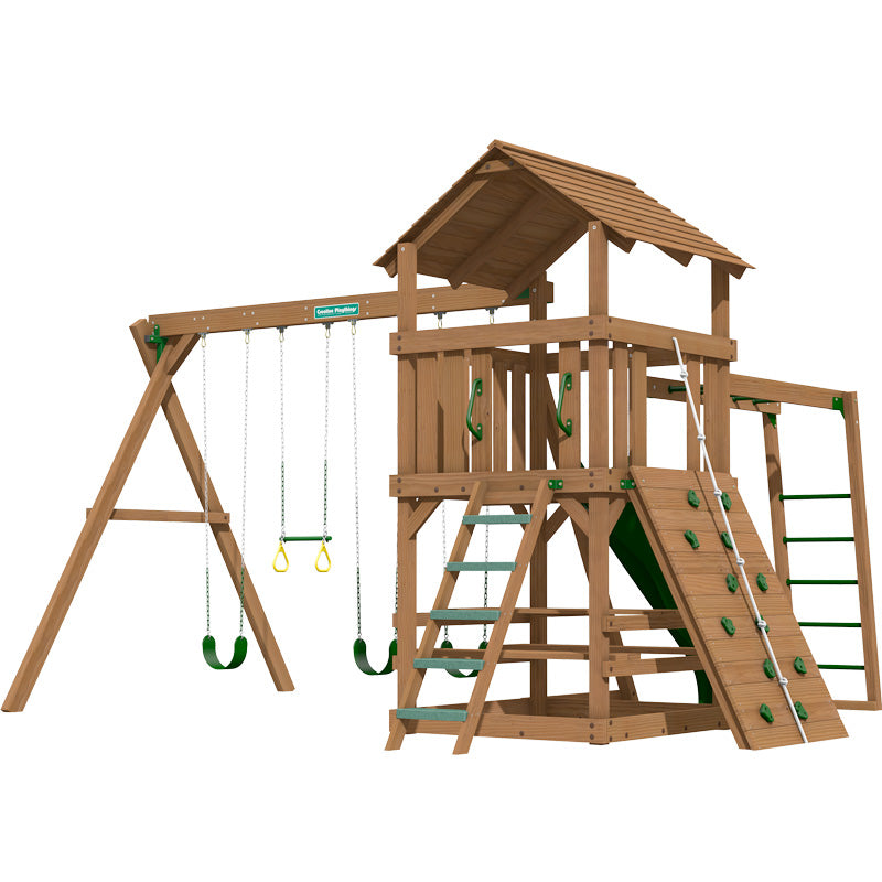 The wooden roof enhances the look of this set and the swing section has been upgraded to the 9ft. high version, in terms of swing height this is as big as it gets on domestic swing frames! The 1.5m (5ft) rock climbing wall, tall monkey bars and picnic table complete this set.