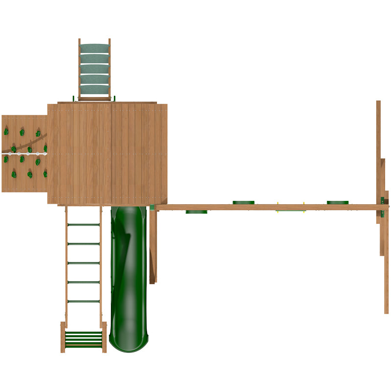 The 9ft. high swing section has four swinging positions with 3 sling swings and 1 trapeze bar with rings. The swing section can be reduced in size to have 2 sling swings and 1 trapeze bar with rings, 3 items in total. This would reduce the width of the set by 60cm.