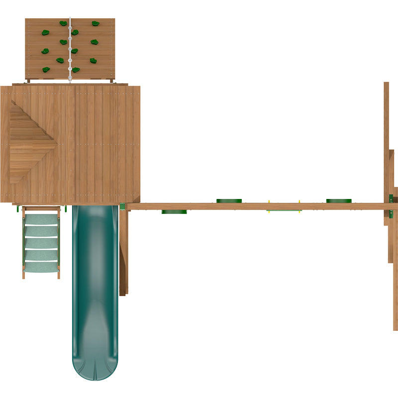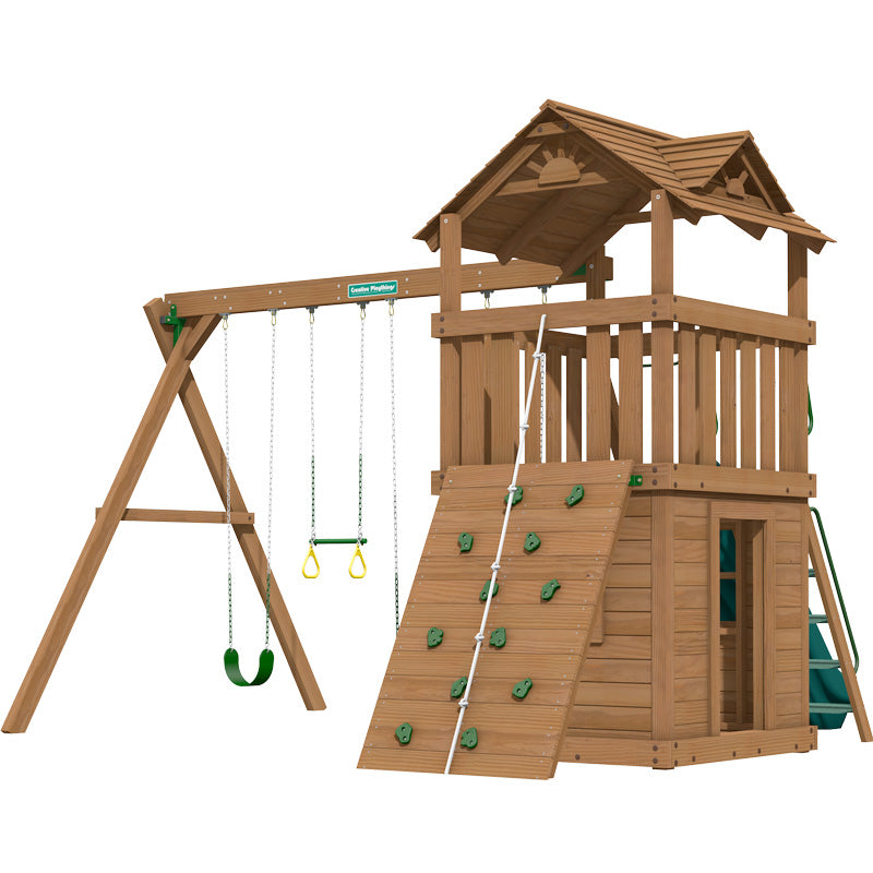 The deluxe wooden roof enhances the look of this set and the 9ft. high swing beam makes the swings as good as they can get. The lower clubhouse adds a playhouse feel to the set and the rock climbing wall adds a challenging activity to the set.The swing section has four swinging positions with 3 sling swings and 1 trapeze bar with rings. The swing section can be reduced in size to have 2 sling swings and 1 trapeze bar with rings, 3 items in total. This would reduce the width of the set by 60cm.