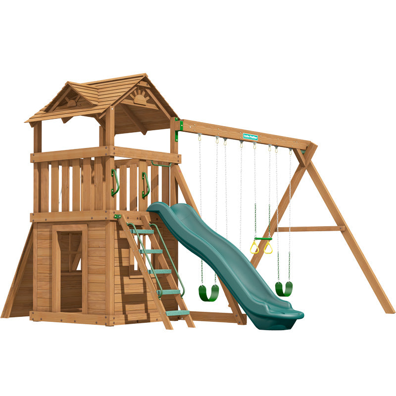 The deluxe wooden roof enhances the look of this set and the swing section has been upgraded to the 9ft. high version, in terms of swing height this is as big as it gets on domestic swing frames!. The lower clubhouse adds a playhouse element to this set while still managing to have a rock climbing wall and luxury super wave slide.