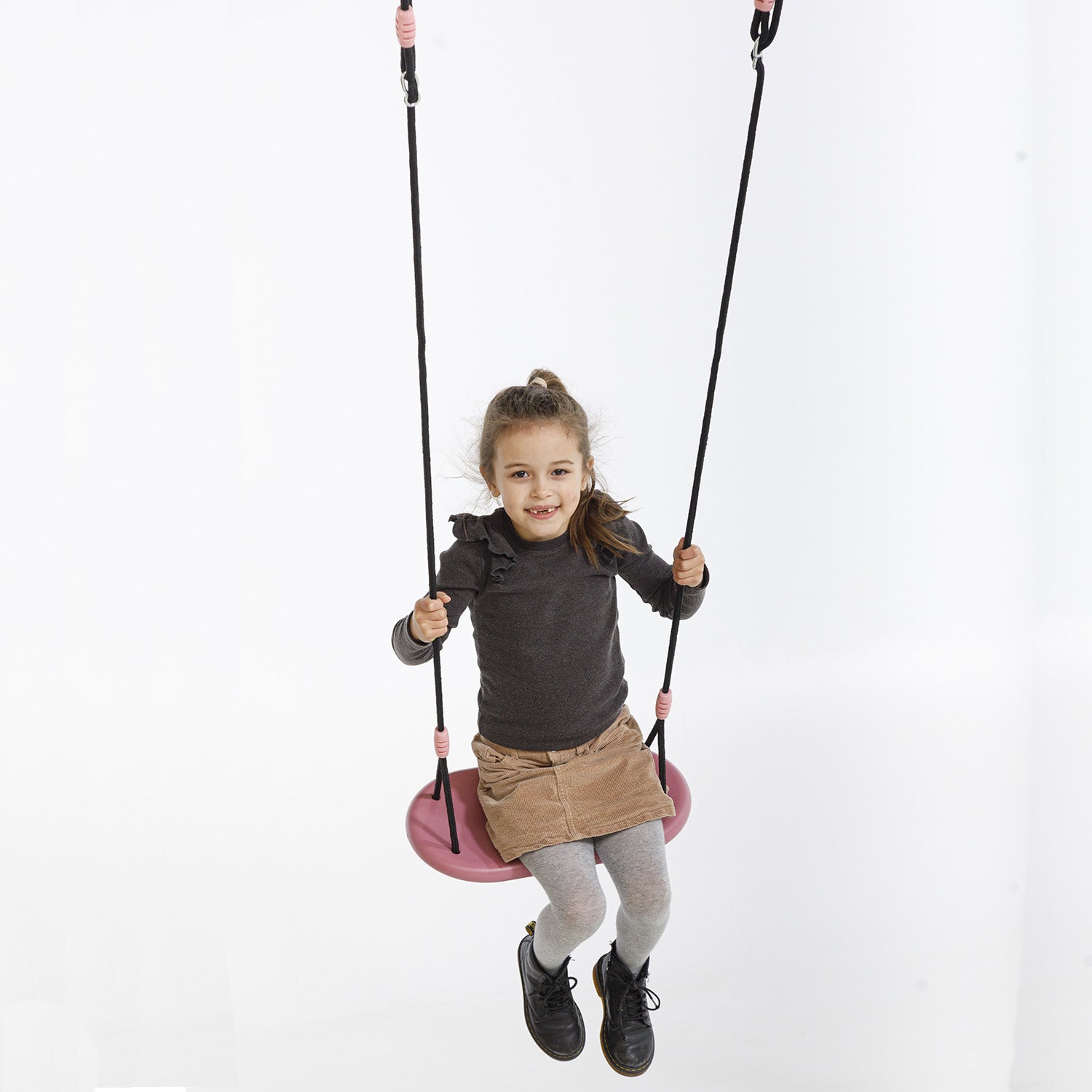The Ergonomic Swing Seat XXL is available in a choice of pastel green, pastel pink or anthracite, carefully selected to blend naturally into garden surroundings. These soft, modern tones complement both wooden and metal swing frames, creating a calm, understated look that sits beautifully in outdoor spaces. The seat is finished with black braided ropes, which visually recede far more than traditional natural-coloured ropes, helping the swing blend into the background rather than drawing attention to the hanging system.