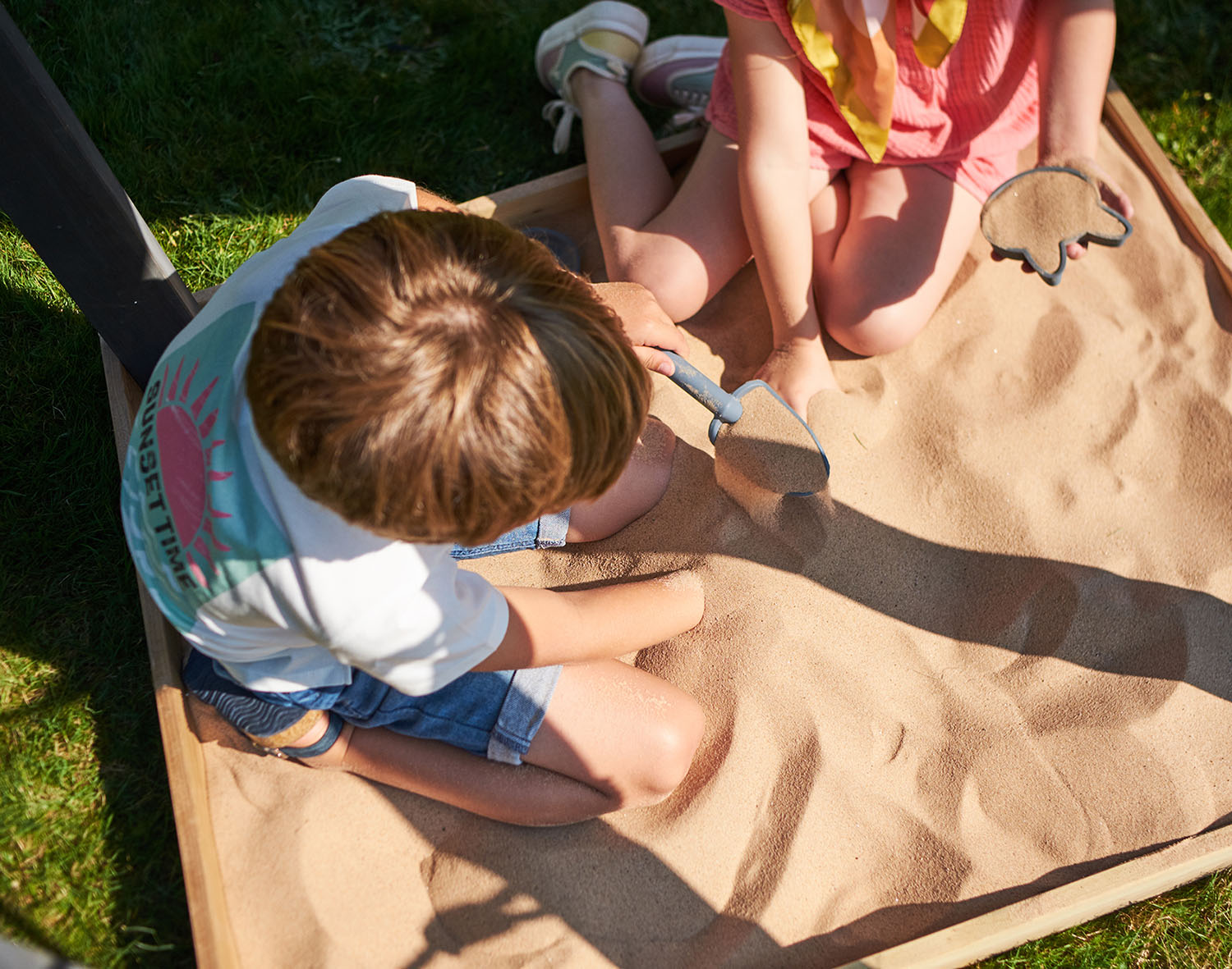- Square sandpit with fabric liner, which protects the sand from soil and debris, and allows water drainage. Sand and sand toys are not included.