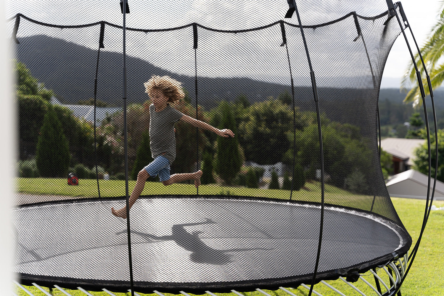 This Jumbo round Sprinfree trampoline is BIG with a BIG bounce. Because of the Springfree design, the equivillant sprung trampoline would need to be a 15ft round one to give the same bouncing space that his model has!