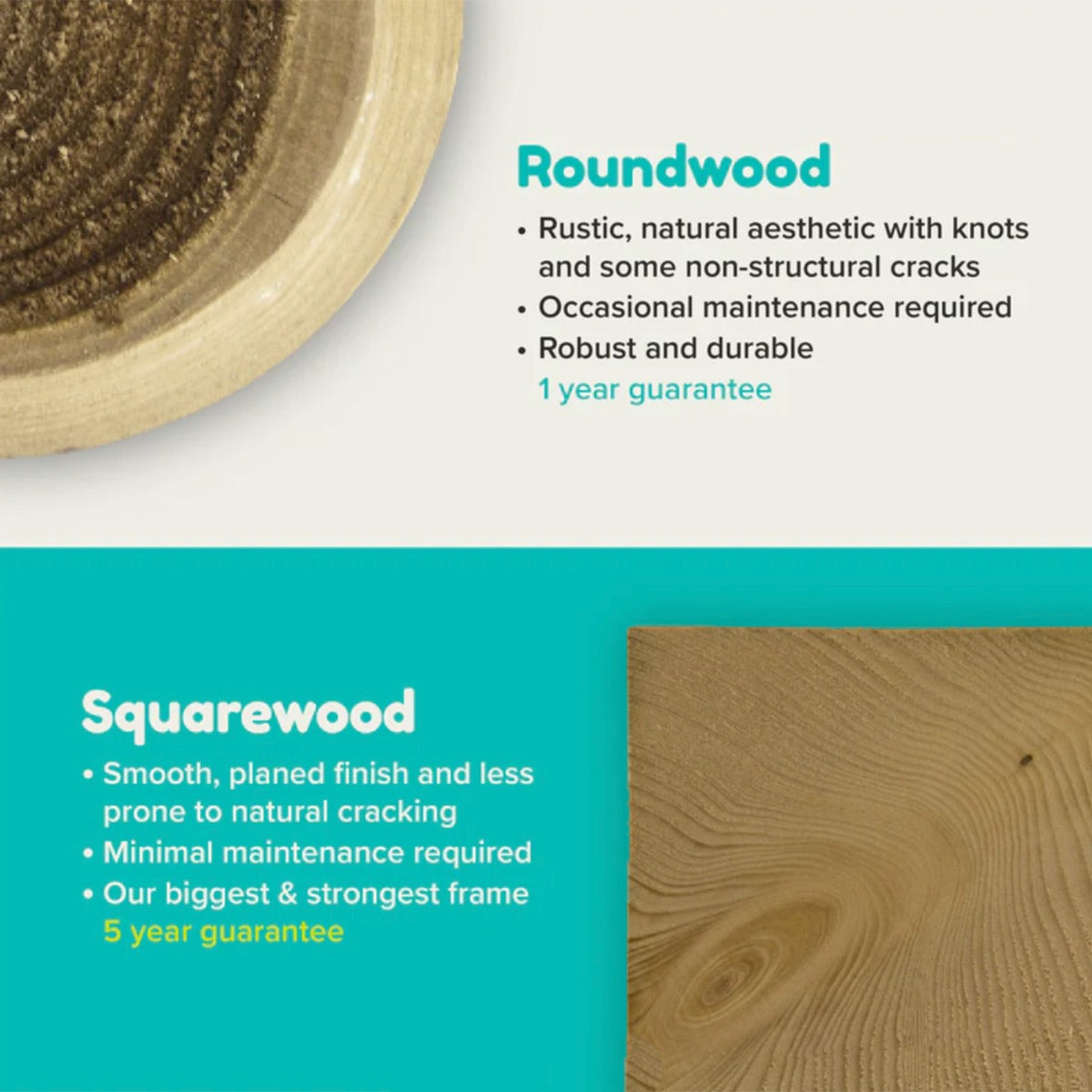 Unlike round wood, squared wood tends to be derived from large, far more mature trees. It is removed from the much larger mature tree poles and includes very little, if any, heartwood in its profile. Squared wood then undergoes a significant manufacturing process. The wood is planed and smoothed to be made ready for the cutting and drilling of each of the dimensioned parts required to make a square wood playframe. Therefore, although cracks and splits will be present and can appear over time due to changes in local atmospheric conditions, the incidence of these splits and cracks will be far fewer than with round wood so maintenance will be less. However, a diligent maintenance regime is strongly recommended and full instructions are given with every frame. So cracks and splits are not considered as faults in our wood frames. They are unavoidable natural characteristics that are taken into account when we design our products. Learn more about timber in our know about wood section.